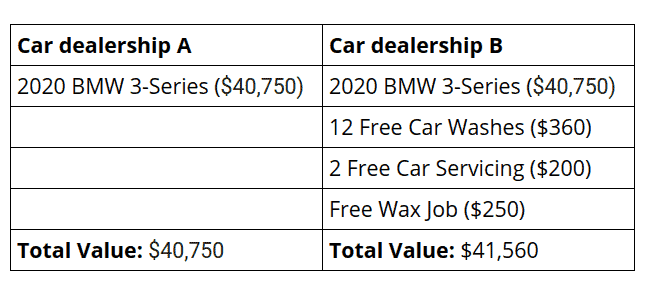 What if one car dealership increased the value by turning it into an offer? What if they added additional items that didn’t cost them much?
