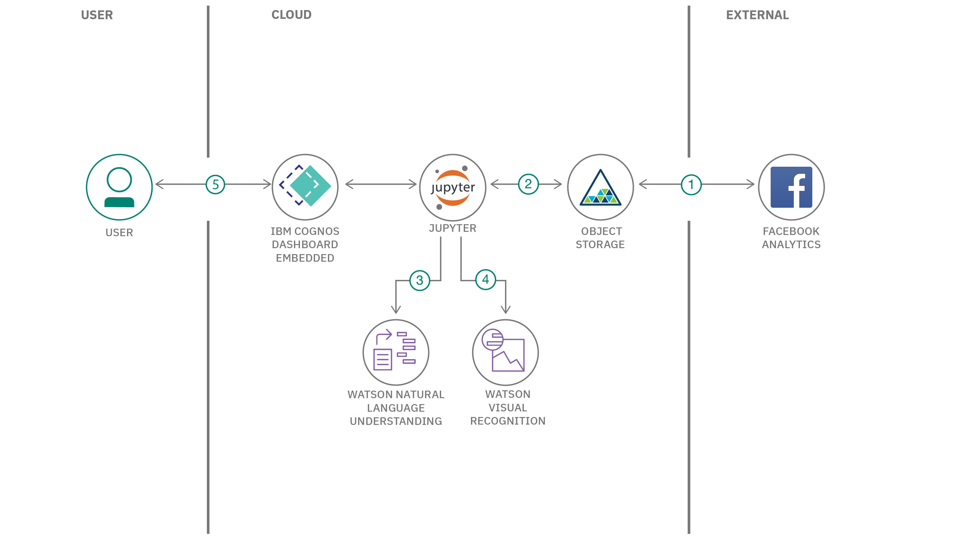 Combine the power of a Jupyter Notebook, Cognos Dashboard Embedded, and IBM Watson™ natural language processing to glean useful marketing insight from a vast body of unstructured Facebook data. To help improve brand perception, product performance, customer satisfaction, and audience engagement, take data from a Facebook Analytics export, enrich it with Watson Visual Recognition and Natural Language Understanding, and create interactive charts to outline your findings. Credit goes to Anna Quincy and Tyler Andersen for providing the initial notebook design.