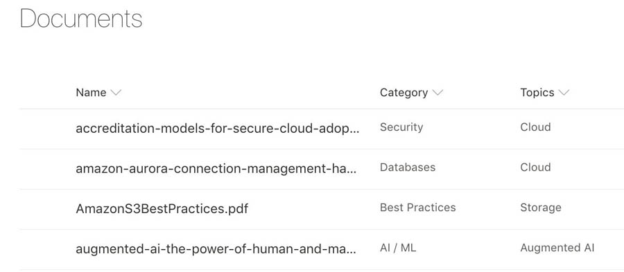 For this use case, our SharePoint Online site contains a collection of AWS whitepapers with custom columns, such as Topics.