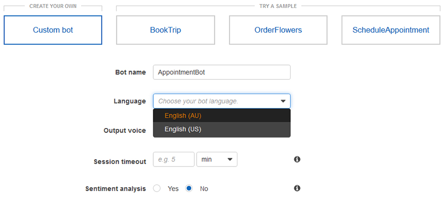 For this post, you will create an Amazon Lex bot called AppointmentBot. Alternatively, you can also import the sample bot directly and skip the bot creation process.
