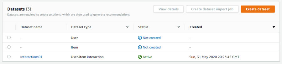 The following screenshot shows the Datasets page on the Amazon Personalize console.