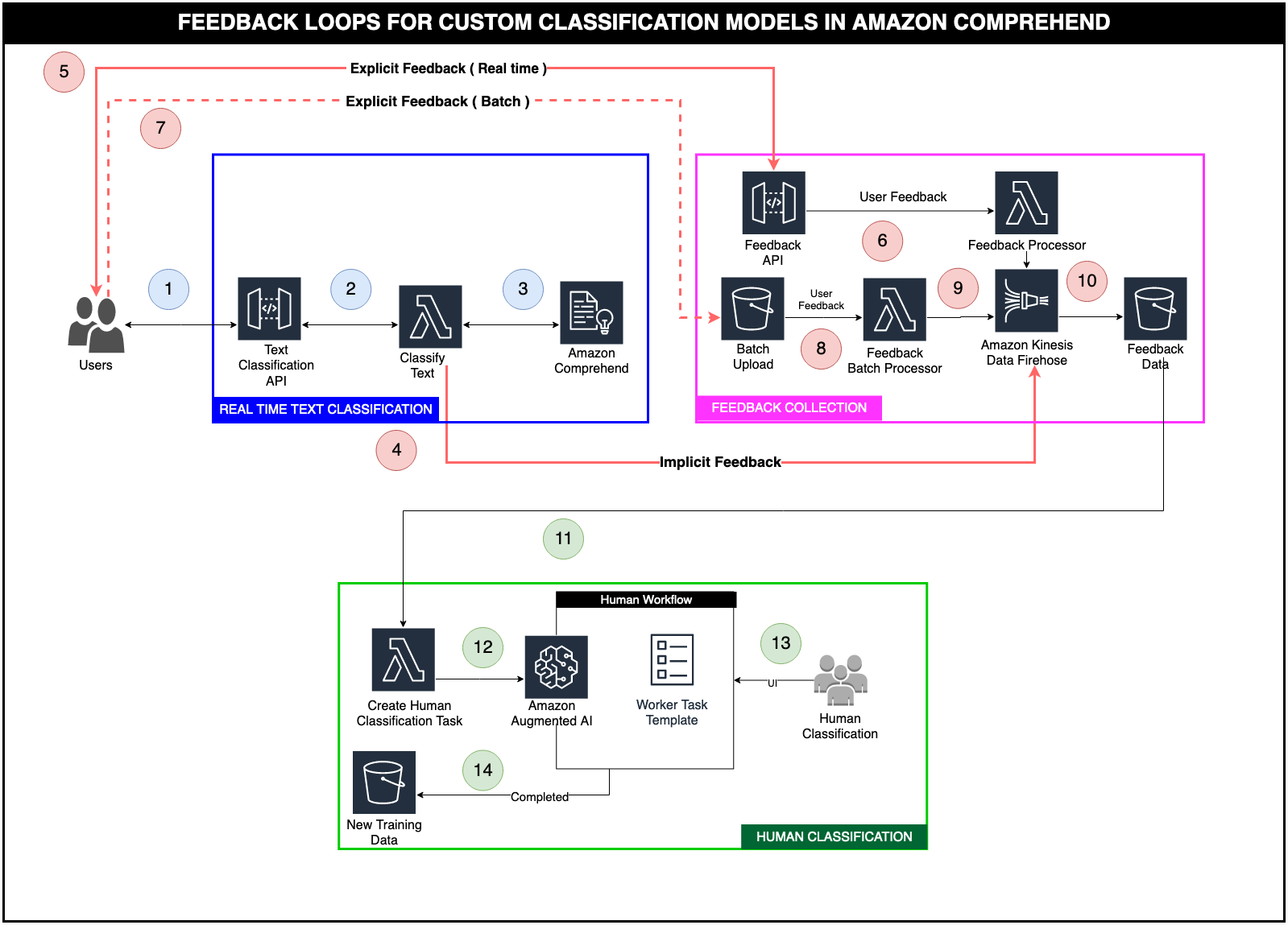 In this two part blog series, we discuss an architecture pattern that allows you to build an active learning workflow for Amazon Comprehend custom classification models. The first post will describe a workflow comprising real-time classification, feedback pipelines and human review workflows using Amazon Augmented AI (Amazon A2I). The second post will cover the automated model building using the human reviewed data, selecting the best model, and automated deployment of an endpoint of the chosen model.