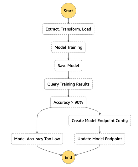 Several machine learning(ML) workflows involve preprocessing data with Spark (or other libraries) and then passing in training data to a training step. The following workflow shows an Extract, Transform and Load (ETL) step that leads to model training and finally to model endpoint deployment using AWS Step Functions.