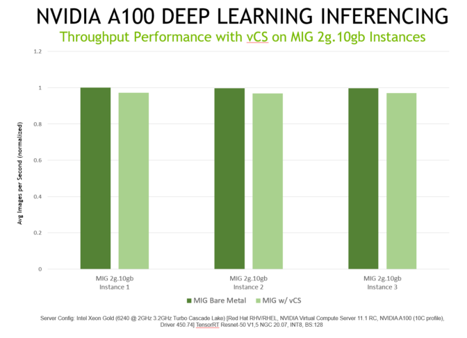 - Multi-Instance GPU (MIG) with VMs: MIG expands the performance and value of NVIDIA A100 by partitioning the GPUs in up to seven instances. Each MIG can be fully isolated with its own high-bandwidth memory, cache and compute cores. Combining MIG with vCS, enterprises can take advantage of management, monitoring and operational benefits of hypervisor-based server virtualization, running a VM on each MIG partition.