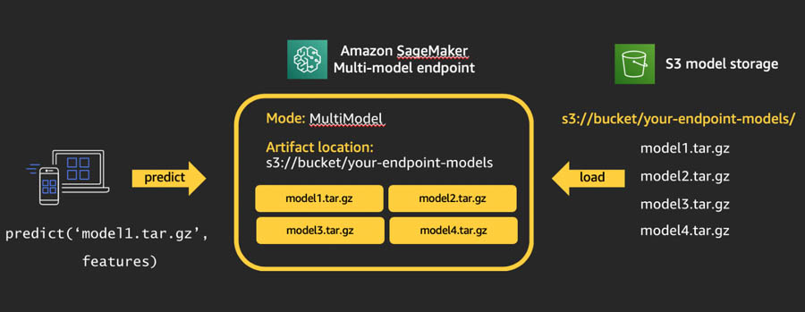 Multiple model artifacts are persisted in an Amazon S3 bucket. When a specific model is invoked, Amazon SageMaker dynamically loads it onto the container hosting the endpoint. If the model is already loaded in the container’s memory, invocation is faster because Amazon SageMaker doesn’t need to download and load it.