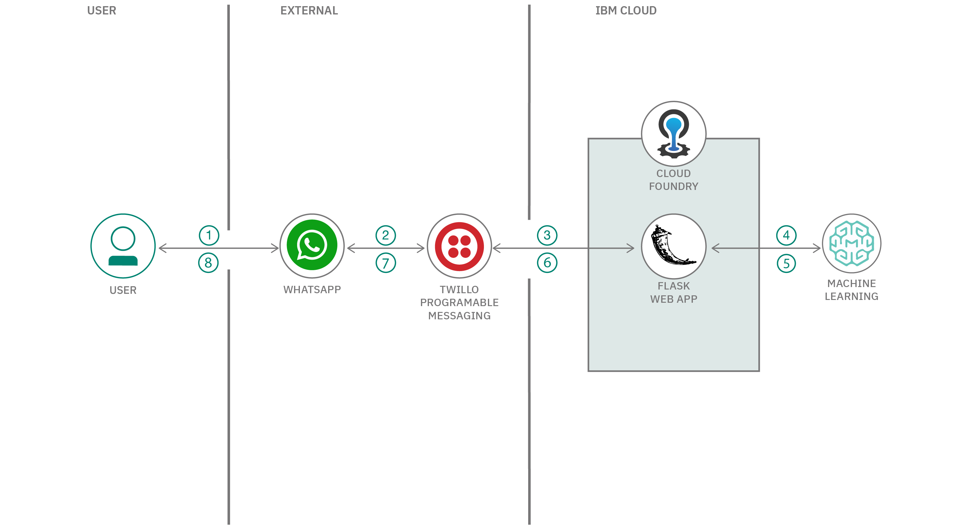 - Twilio Programmable Messaging will forward the message to the back-end app hosted on IBM Cloud.