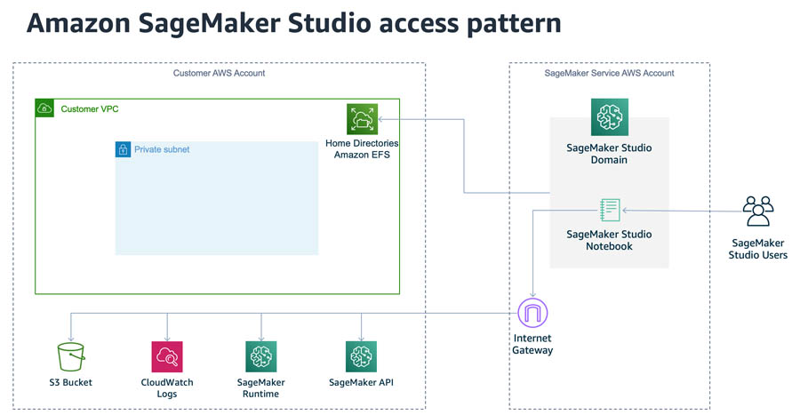 Some examples of security best practices are Amazon S3 access control and limiting internet ingress and egress. In this section, we see how to implement them in combination with running Amazon SageMaker Studio in a private VPC.