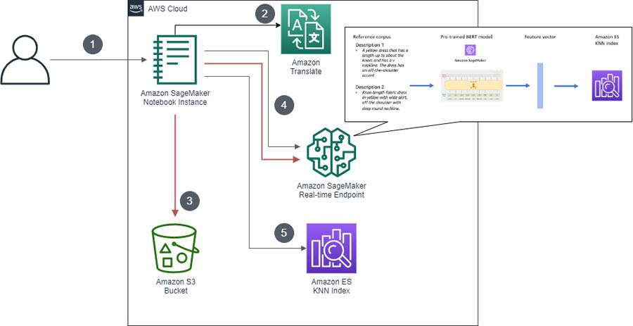 In this step, you translate each dress description from German to English using Amazon Translate. From each English description, you extract the feature vector, which is an n-dimensional vector of numerical features that represent the dress. You use a pre-trained BERT model hosted in Amazon SageMaker to extract 768 feature vectors of each visual description of the dress, and store them as a KNN index in an Amazon ES domain.