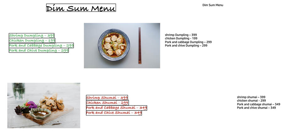 Our menu digitization system can extract text from images of menus, group it by menu section, extract the title of the section, extract the dishes within each section, and pair each dish with its price. The following is a visualization of the end-to-end solution.