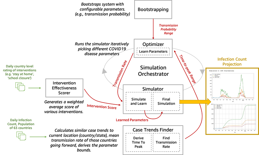 There have been breakthroughs in understanding COVID-19, such as how soon an exposed person will develop symptoms and how many people on average will contract the disease after contact with an exposed individual. The wider research community is actively working on accurately predicting the percent population who are exposed, recovered, or have built immunity. Researchers currently build epidemiology models and simulators using available data from agencies and institutions, as well as historical data from similar diseases such as influenza, SARS, and MERS. It’s an uphill task for any model to accurately capture all the complexities of the real world. Challenges in building these models include learning parameters that influence variations in disease spread across multiple countries or populations, being able to combine various intervention strategies (such as school closures and stay-at-home orders), and running what-if scenarios by incorporating trends from diseases similar to COVID-19. COVID-19 remains a relatively unknown disease with no historic data to predict trends.