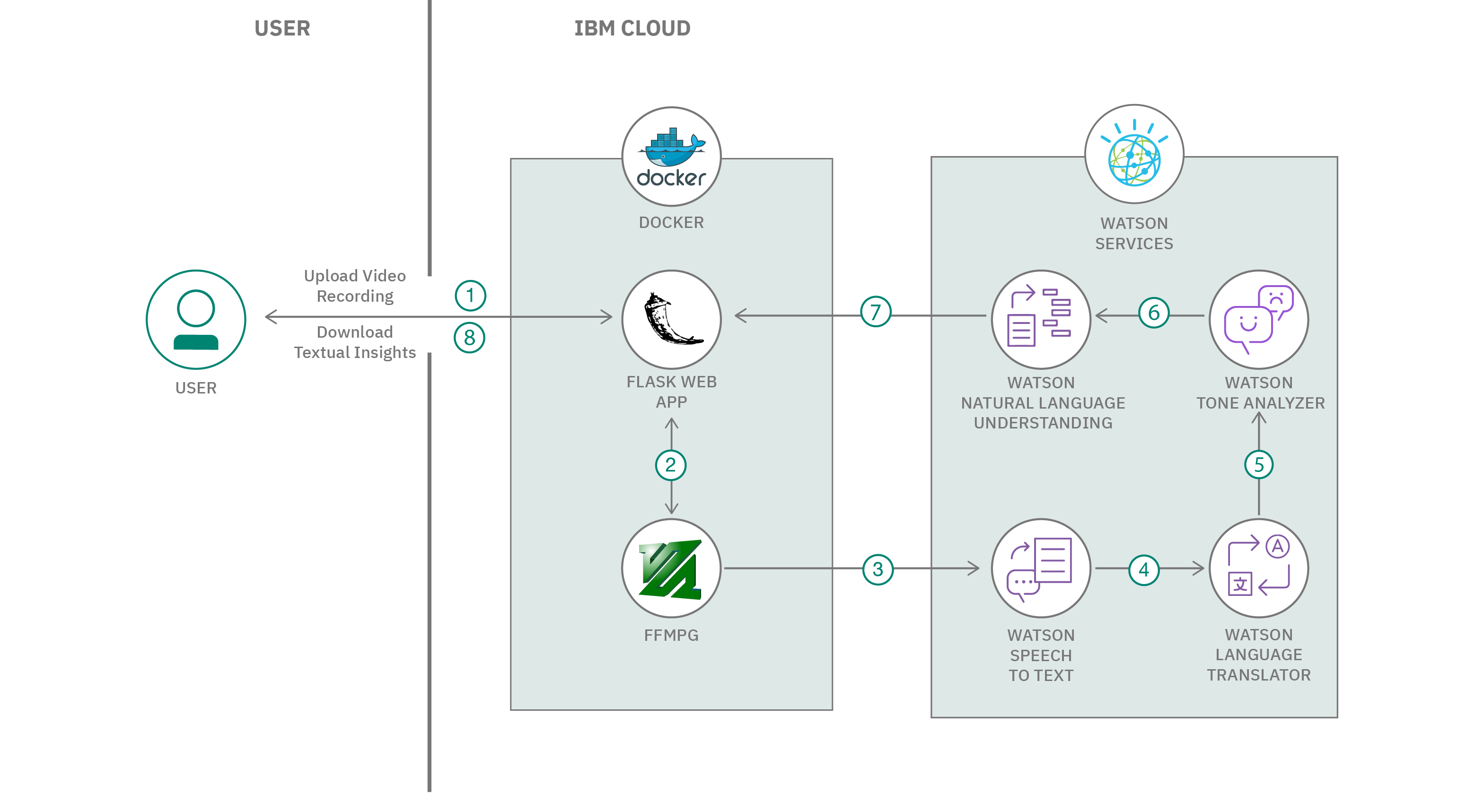 - (Optionally) The Watson Language Translator service translates other languages into an English transcript.