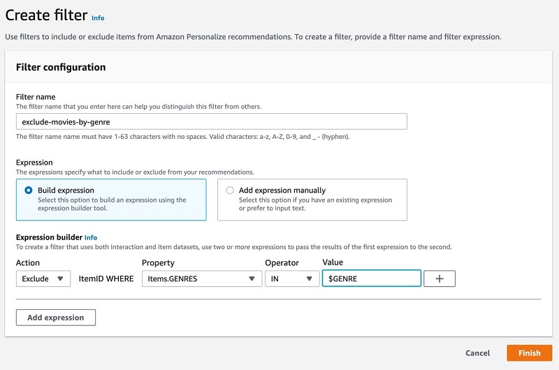 Creating a filter on the Amazon Personalize console