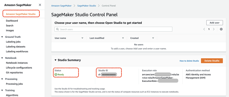 AmazonSageMakerFullAccesspolicy attached. If you have onboarded to SageMaker Studio, you can get the role from the Studio Summary section on the SageMaker Studio Control Panel. - A SageMaker Studio domain. For instructions, see Onboard to Amazon SageMaker Studio.