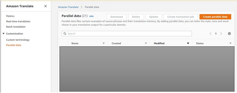 1. On the Amazon Translate console, under Customization, choose Parallel data.