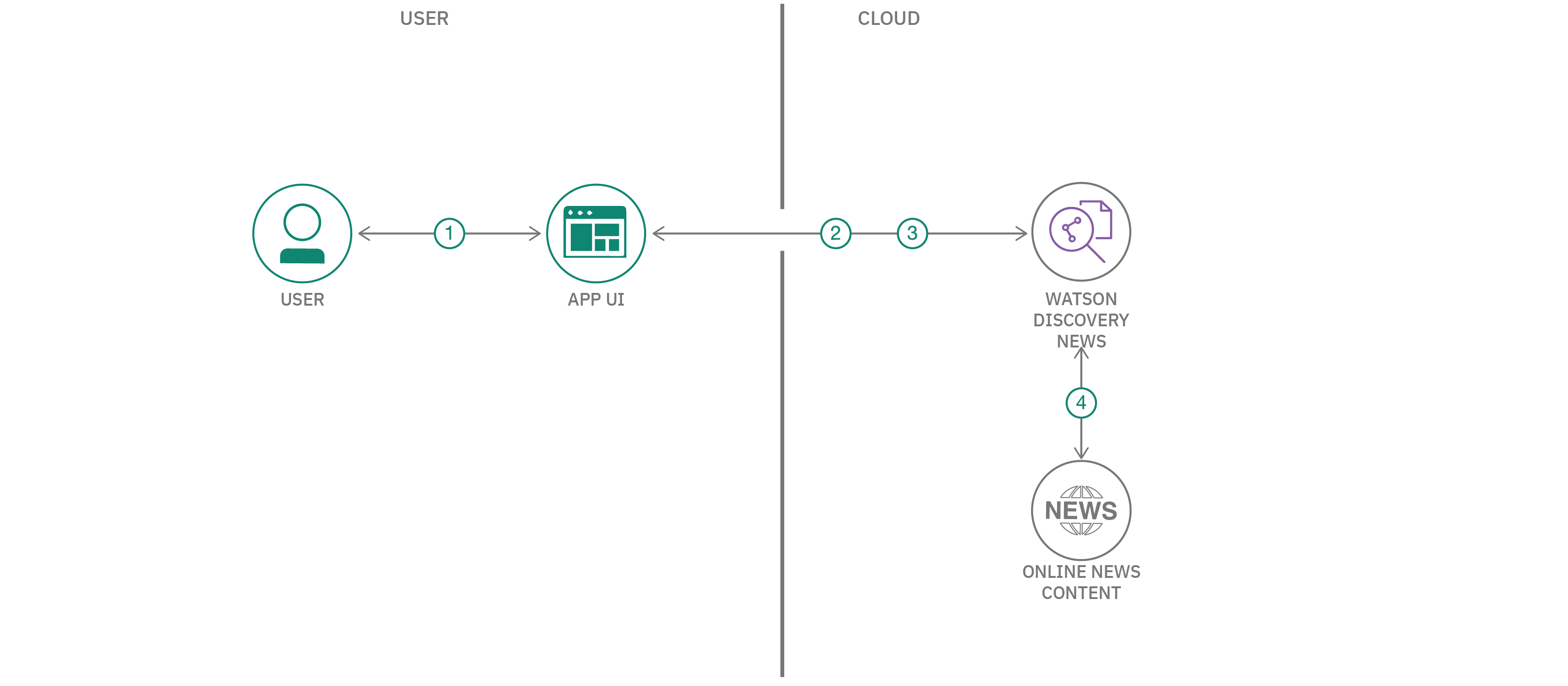 - The Watson Discovery News Server sends user requests to the Watson Discovery Service.