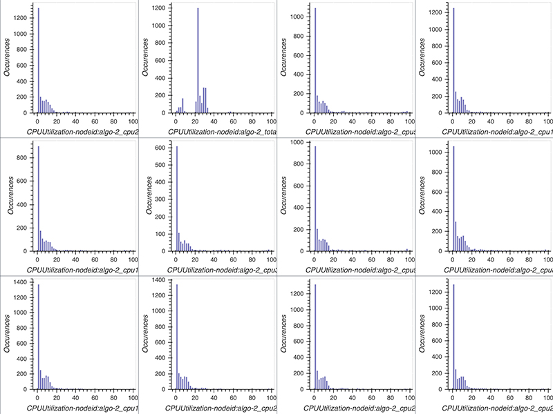 The following code plots the histograms per metric. To only plot specific metrics, define the list select_dimensions and select_events. A dimension can be CPUUtilization, GPUUtilization, or GPUMemoryUtilization IOPS. If no event is specified, then for the CPU utilization, a histogram for each single core and total CPU usage is plotted.