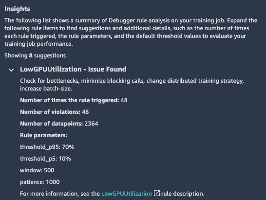 In our example, it has identified low utilization of the GPU and advises us to check for bottlenecks or increase the batch size. The low GPU utilization should raise a red flag for us. As we mentioned earlier, the GPU is typically the most expensive resource you use, and you should always strive to maximize its use.