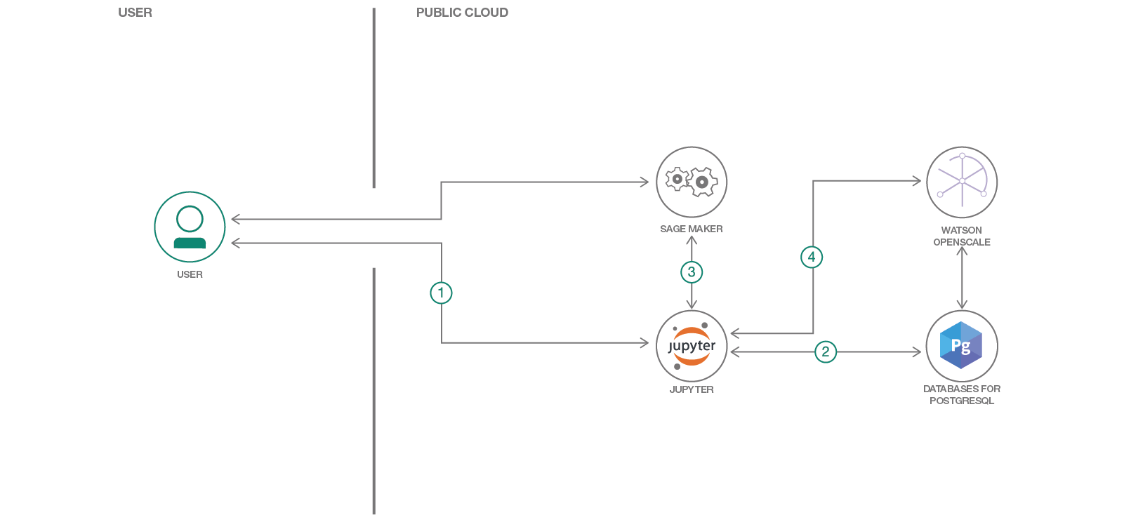 2. The Jupyter Notebook is connected to a PostgreSQL database that stores the Watson OpenScale data.
