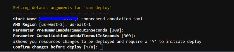• cfn-name: The name of the CloudFormation stack name entered in the Package and Deploy step: comprehend-annotation-tool