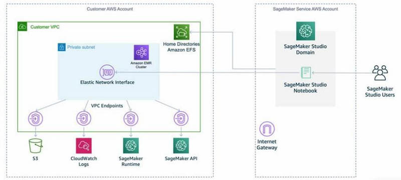 Studio runs on an environment managed by AWS. In this solution, the network access for the new Studio domain is configured as VPC Only. For more details on different connectivity methods, see Securing Amazon SageMaker Studio connectivity using a private VPC. The elastic network interface created in the private subnet connects to required AWS services through VPC endpoints.