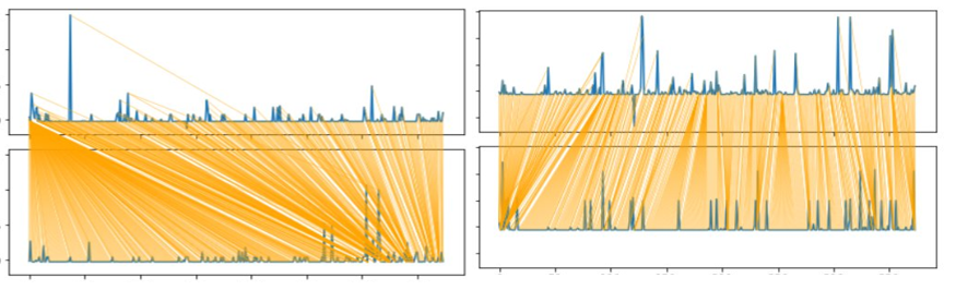As seen here, matches between the pair of time series are aligned along a warped temporal path (for e.g. time 0th instance of the top-left time series is matched with multiple time points of the bottom left time series, and not strictly t0 to t0, t1 to t1… for the different pairs of time series).