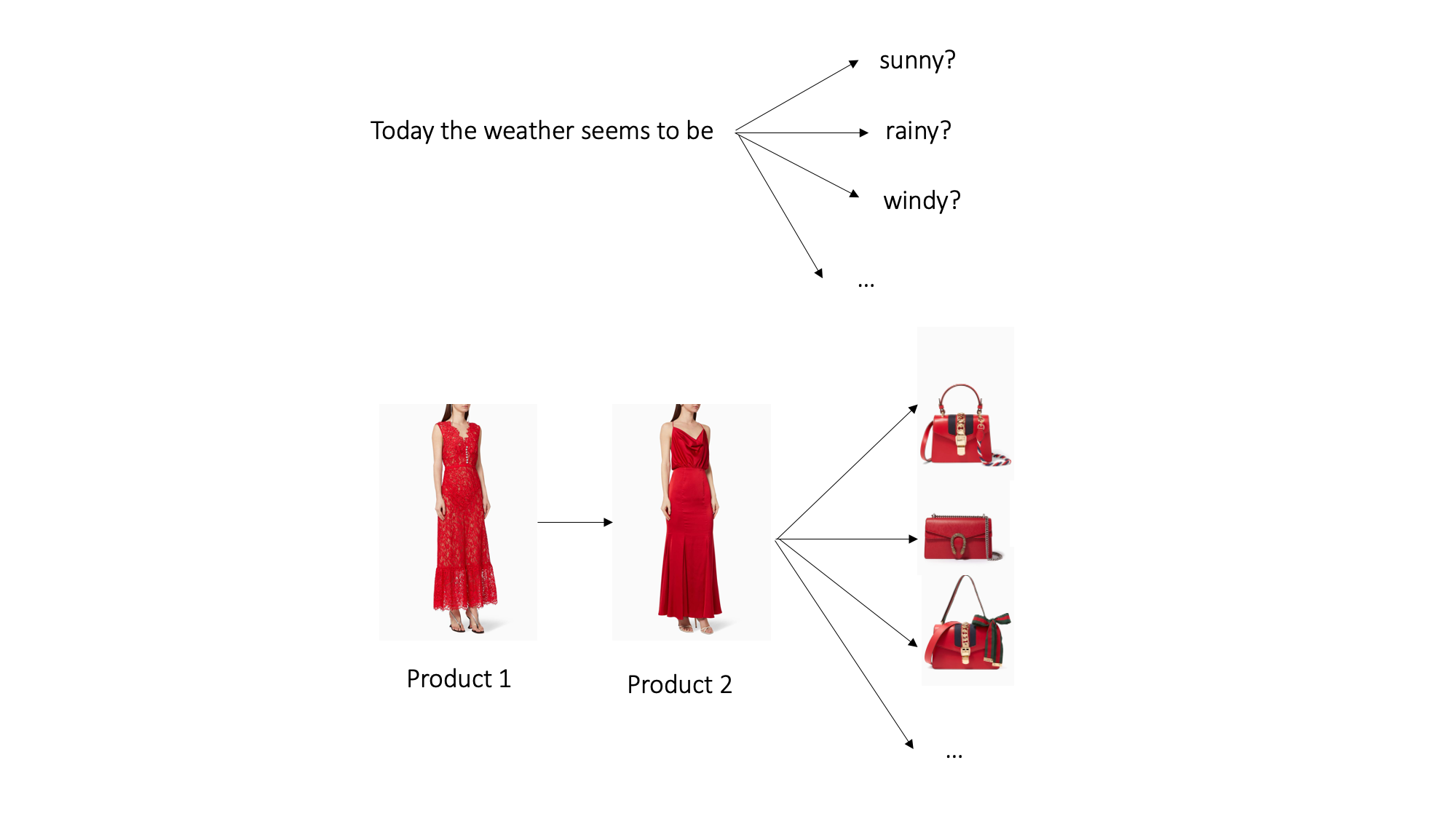 Similarly to the example sentence, which is likely to end with the suggested words, the shown bags are more likely to appear after the sequence of products in the shown session.