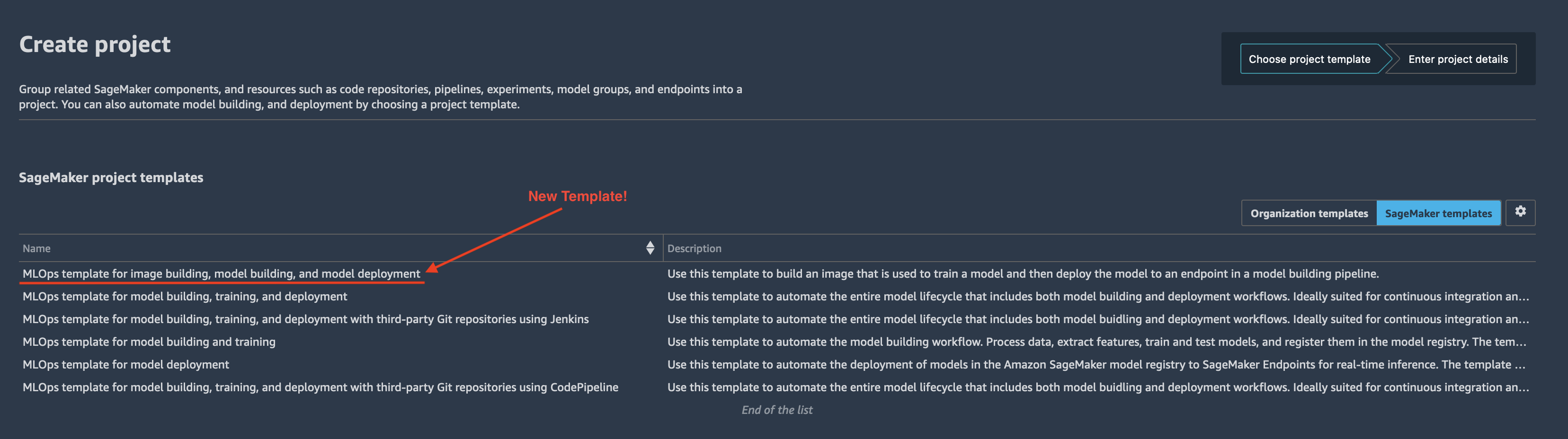 You can now use SageMaker projects to manage custom dependencies through an image building continuous integration and continuous delivery (CI/CD) pipeline that’s available as a first-party template on Amazon SageMaker Studio. This new capability gives developers the flexibility to make updates to the images you use for training, processing, and inference by changing the container files in your project’s source control repositories, which automatically triggers an image building pipeline. The template uses AWS CodeCommit as the code repository. You can use the newly created images in a SageMaker pipeline for processing, training, and inference.