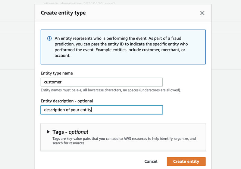 - On the Create entity type page, enter an entity name and optionally an entity description.