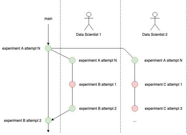 When data scientists are working on a new model, that work is often experimental, meaning that unsuccessful experiments may be discarded and those with good results can go into production. Each data scientist may be working on a particular attempt at improving the current objective function. While one may be trying out a different architecture, another may be trying a new set of hyperparameters, for instance.