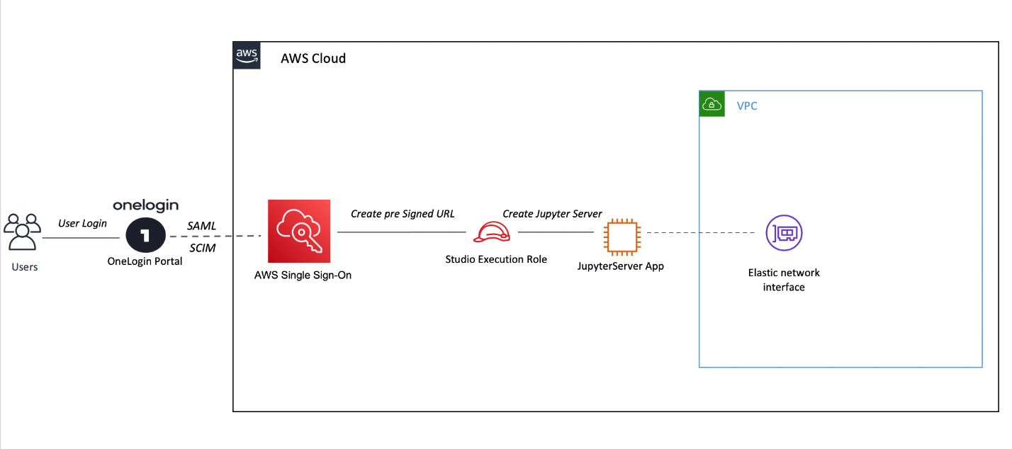 The following architecture diagram shows the flow of authentication and authorization from OneLogin to Amazon SageMaker Studio. Users log in through OneLogin, which authenticates them and passes a SAML authentication to AWS SSO. Once logged in, they can select the Amazon SageMaker Studio app, which assumes the SageMaker execution role attached to their user profile to create a pre-signed domain URL. This pre-signed domain URL is used directly log in the users to their JupyterServer environment.