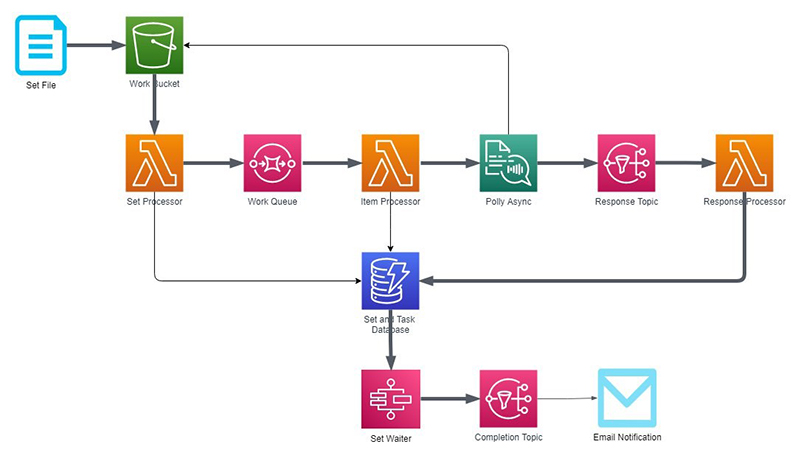 The solution is fully serverless, consisting chiefly of a set of AWS Lambda functions. These functions track the items to be synthesized. Submit them to Amazon Polly for synthesis, and process the results as they’re completed. The functions use shared Amazon DynamoDB tables to manage the state of the work over time. An AWS Step Functions workflow tracks each submitted set, and notifies interested parties of its completion via an Amazon Simple Notification Service (Amazon SNS) topic.