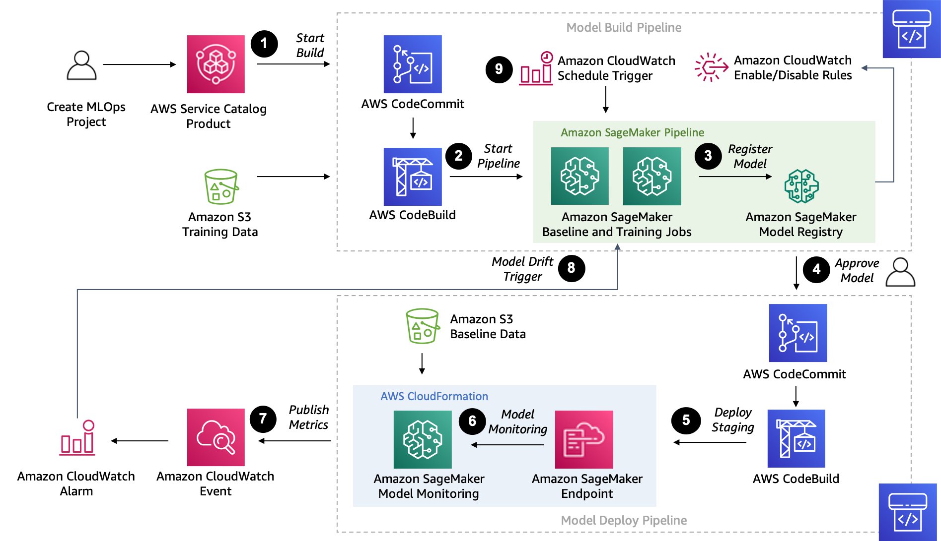 Training your machine learning (ML) model and serving predictions is usually not the end of the ML project. The accuracy of ML models can deteriorate over time, a phenomenon known as model drift. Many factors can cause model drift, such as changes in model features. The accuracy of ML models can also be affected by concept drift, the difference between data used to train models and data used during inference. Therefore, teams must make sure that their models and solutions remain relevant and continue providing value back to the business. Without proper metrics, alarms, and automation in place, the technical debt from simply maintaining existing ML models in production can become overwhelming.