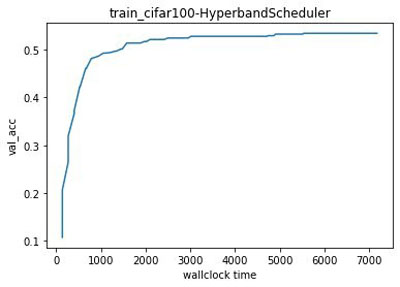 The log of the trials is stored in the aforementioned folder for further analysis. At any time during the tuning job, we can easily get the results obtained so far by calling load_experiment(“train-cifar100-2021-11-05-15-22-27-531”) and plotting the best result obtained since the start of the tuning job: