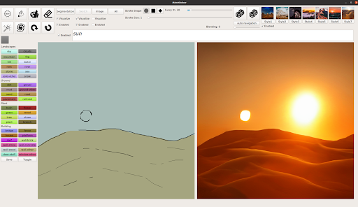With the press of a button, users can generate a segmentation map, a high-level outline that shows the location of objects in the scene. From there, they can switch to drawing, tweaking the scene with rough sketches using labels like sky, tree, rock and river, allowing the smart paintbrush to incorporate these doodles into stunning images.
