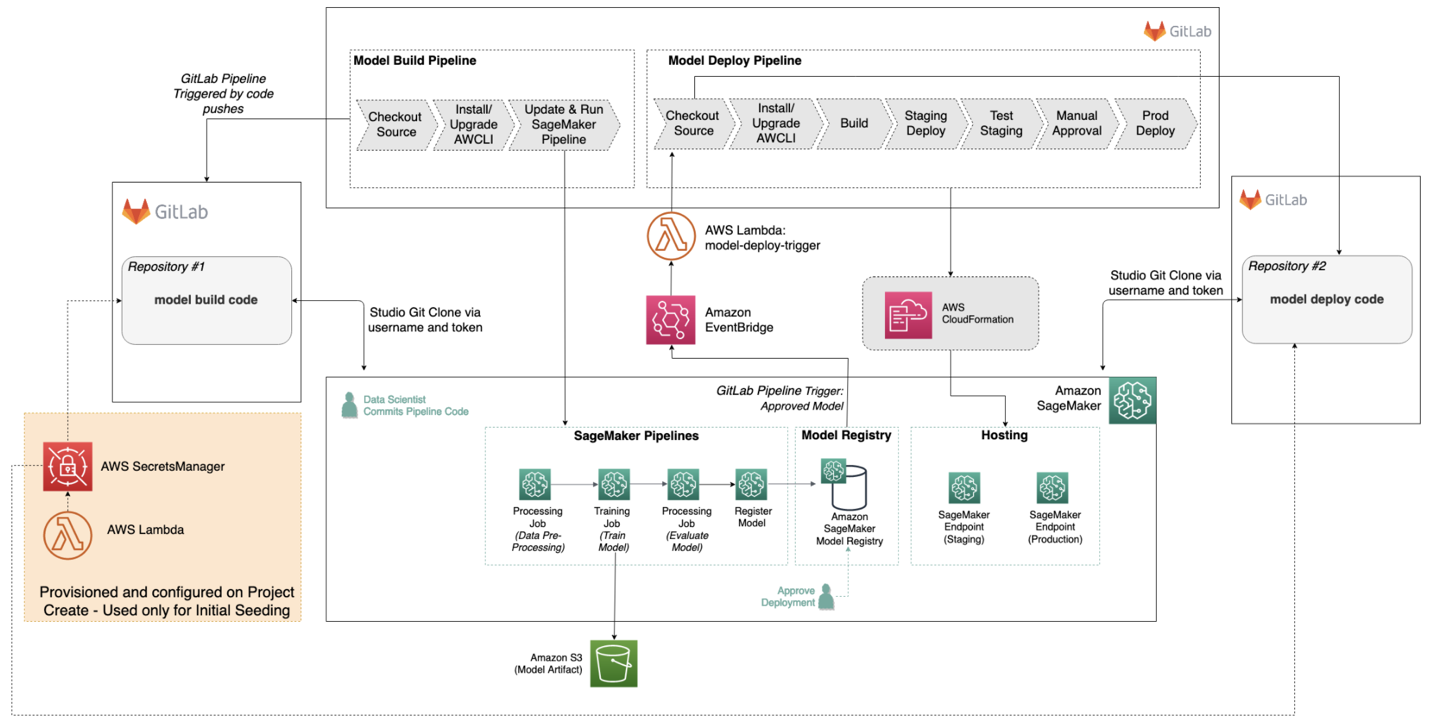 - GitLab – Acts as our code repository and enables CI/CD using GitLab pipelines. The custom SageMaker project template creates two repositories (model build and model deploy) in your GitLab account.
