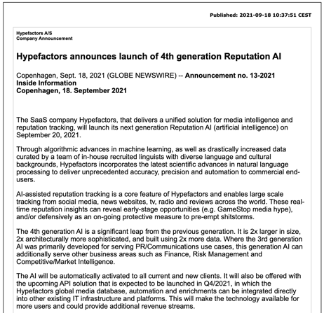 At Hypefactors, we build tech for media intelligence and reputation management. The solution is a software as a service (SaaS) product that does large-scale media monitoring of social media, news sites, TV, radio, and reviews across the world. The tracked data is streamed continuously and enriched in real time. This yields insights that can reveal early business opportunities (for example, GameStop hype), track the success of product launches, and preempt disasters.