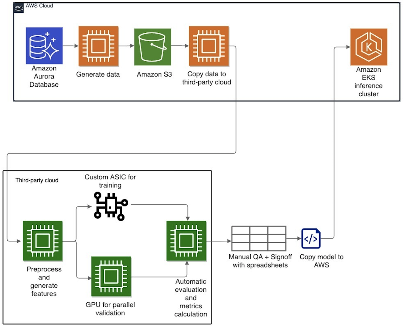 At a high level, the following diagram captures Cresta’s previous architecture spanning two public cloud service providers. The main datasets were hosted and maintained on Amazon Aurora, and training was performed outside AWS, on another cloud service provider, using custom chips. Based on training requirements, a subset of the data would be curated from Aurora, copied to Amazon Simple Storage Service (Amazon S3), then exported out of AWS into the other cloud where Cresta trained their NLP models. The size of data moved each time ranged from 1–100 GB. The ML training pipeline was built around Argo Workflows, which is an open-source workflow engine where each step in a workflow is implemented in a container. Once trained, the models were automatically evaluated for accuracy before manual checks. The models that passed this validation were imported back to AWS, containerized, and deployed into production using Amazon Elastic Kubernetes Service (Amazon EKS). Cresta’s production inference was hosted on AWS.