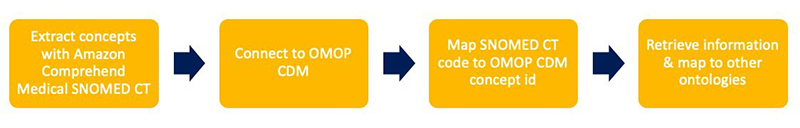 Amazon Comprehend Medical is a HIPAA-eligible natural language processing (NLP) service that uses machine learning (ML) to extract clinical data from unstructured medical text—no ML experience required—and automatically map them to SNOMED CT, ICD10, or RxNorm ontologies with a simple API call. You can then add the ontology codes to your EHR database to augment patient data or link to other ontologies as desired through OMOP CDM. For this post, we demonstrate the solution workflow as shown in the following diagram with code based on the example sentence “Patient X was diagnosed with insomnia.”