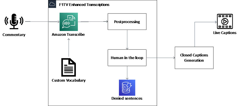 In the following sections, we take a deep dive into how AWS Professional Services partnered with F1 to build a robust, state-of-the-art, real-time race commentary captioning system by enhancing Amazon Transcribe to understand the particularities of the F1 world. You will learn how to utilize Amazon Transcribe in real-time broadcasts and supercharge live captioning for your use case with custom vocabularies, postprocessing steps, and a human-in-the-loop validation layer.