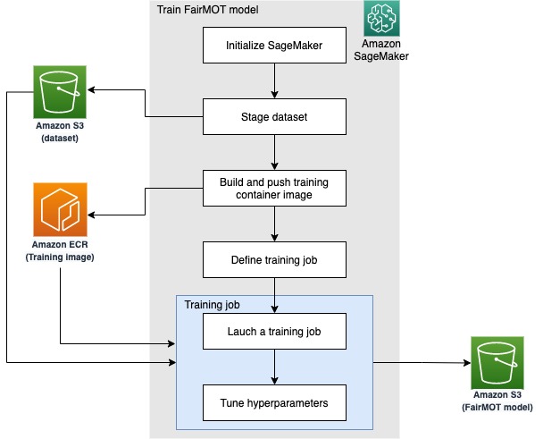 Amazon SageMaker is a fully managed service that provides every developer and data scientist with the ability to prepare, build, train, and deploy machine learning (ML) models quickly. SageMaker provides several built-in algorithms and container images that you can use to accelerate training and deployment of ML models. Additionally, custom algorithms such as FairMOT can also be supported via custom-built Docker container images.