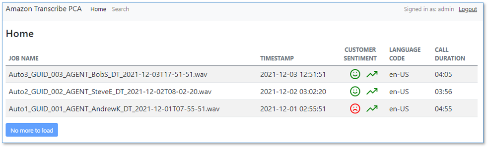 You’re now logged in to PCA. Because you set loadSampleAudioFiles to true, your PCA deployment now has three sample calls pre-loaded for you to explore.