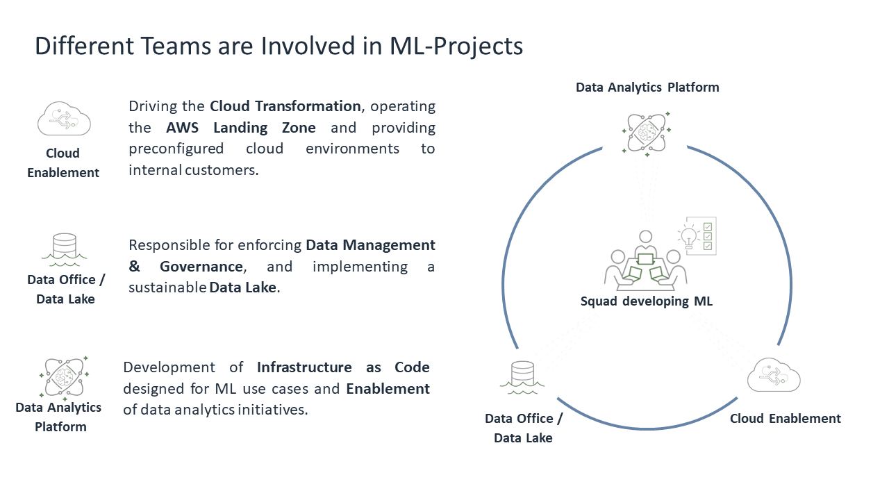 The underlying cloud infrastructure for the entire organization is provided by the squad Cloud Enablement. It is their task to enable the teams to build products upon cloud technologies on their own. This improves the time to market building new products like ML, and it follows the principle of “You build it, you run it”.