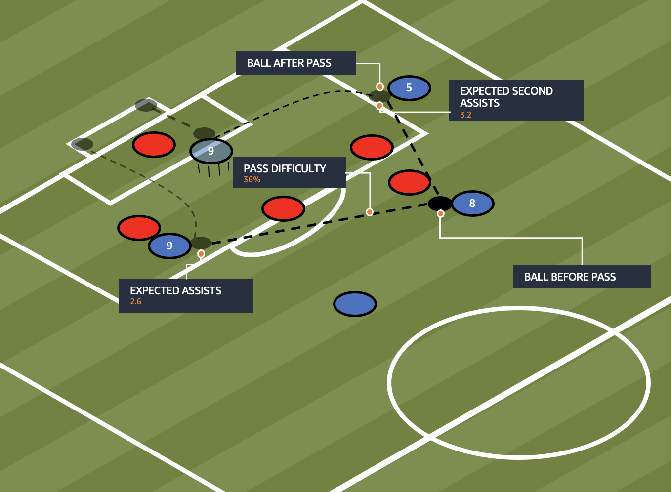 An initiator is a player who performs a high number of valuable first and second assists. To identify and quantify the value of those assists, we introduced the new metric xAssist. It’s calculated by tracking the last and second-last pass before a shot at goal, and assigning the respective xGoals value to those actions. A good initiator creates opportunities under challenging circumstances by successfully completing passes with a rate of high difficulty. To evaluate how hard it is to complete a given pass, we use our existing xPass model. In this metric, we purposely exclude crosses and free kicks to focus on players who generate scoring chances with their precise assists from open play.
