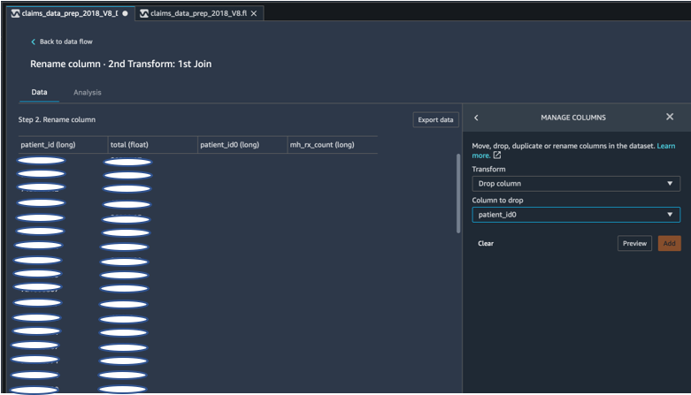 For our experiments, since after each join on the patient ID, we were left with duplicate patient ID columns. We needed to drop these columns. We dropped the right patient ID column, as shown in the following screenshot using the pre-built Manage Columns –>Drop column transform, to maintain only one patient ID column (patient_id in the final dataset).