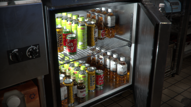 Drinks in a fridge at the virtual ramen shop, made using Omniverse Create, Adobe Substance 3D Painter, Autodesk 3ds Max, Blender, Maxon Cinema 4D, and RizomUV.