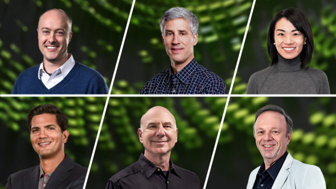 Clockwise, from top left: NVIDIA VP for Accelerated Computing Ian Buck, Senior VP for Hardware Engineering Brian Kelleher, Director of Product Management for Accelerated Computing Ying Yin Shih, CTO Michael Kagan, Senior VP for GeForce Jeff Fisher, VP of Embedded and Edge Computing Deepu Talla.