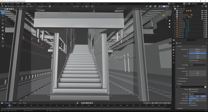 From there, Drago measured the height of a staircase and extrapolated those proportions to the rest of the 3D scene, ensuring it fit the grid size. The scene could then be built modularly, one model at a time. He modeled with lightning speed using NVIDIA RTX-accelerated OptiX ray tracing in the Blender viewport.