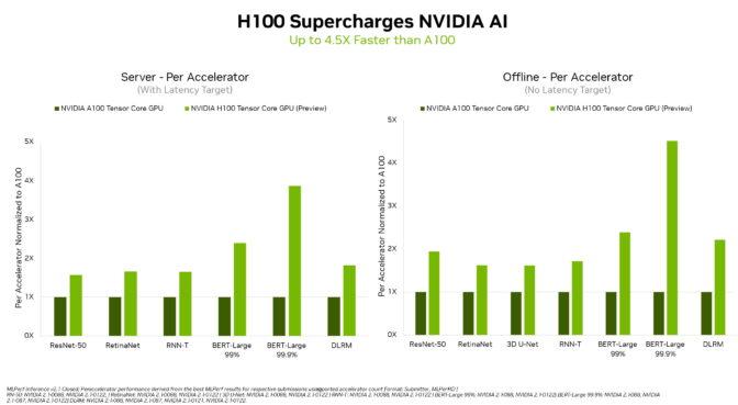 The H100, aka Hopper, raised the bar in per-accelerator performance across all six neural networks in the round. It demonstrated leadership in both throughput and speed in separate server and offline scenarios.