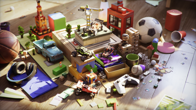 The demo consists entirely of simulation, rather than animation. This means that its 1,800+ hand-modeled and textured 3D models — whether the radio-controlled cars or the dominos they knock over while racing — didn’t require traditional 3D design tasks like baking or pre-compute, which is the presetting of lighting for environments and other properties for assets.