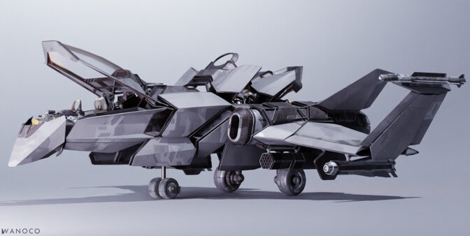 Wano often finds inspiration exploring the diversity of flora and fauna. He has a penchant for examining birds — and even knows the difference in wing shapes between hawks and martins, he said. This interest in flying entities extends to his fascination with aircrafts. For Moon Hawk, Wano took on the challenge of visually evolving a traditional, fuel-based fighter jet into an electric one.